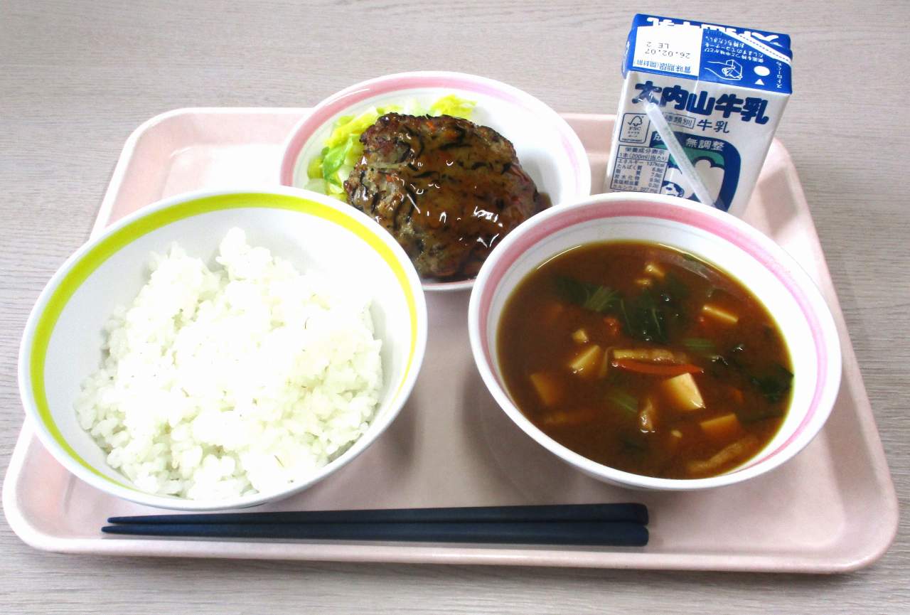 今日の給食は・・・麦ごはん、牛乳、手作りヒジキ入りハンバーグ、みそ汁、添え白菜です。
