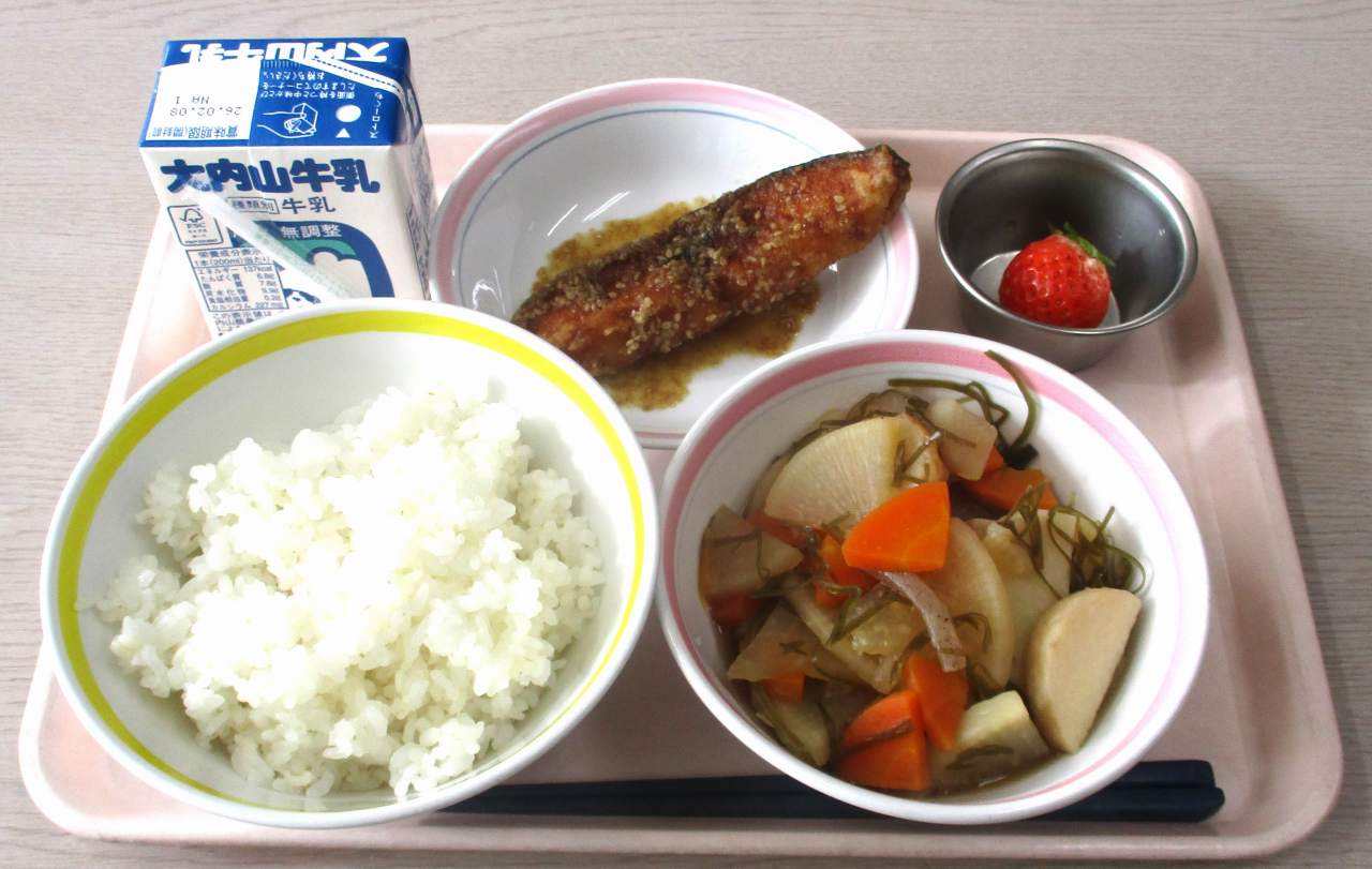 今日の給食は・・・麦ごはん、牛乳、シイラの揚げ煮、大根菜、イチゴです。