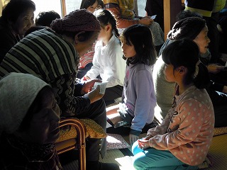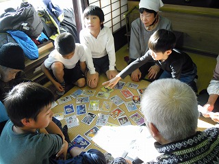 そして、メーンイベント、『カルタ大会』です。3年生一人ひとりがおじいさんやおばあさんとペアになって、6〜8名のグループで、カルタ取りを始めました。最初は行儀よくしていましたが、その内、エキサイト・・・教室さながらの取り合いで、大きな歓声につつまれたもんちゃんの午後でした。