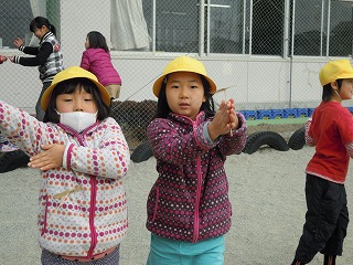 写真は、4年生の学年遊びと1年生の竹とんぼのようす です。