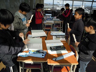 山地先生の優しくも的確な指示と指導のもと、ふだんは元気な3年生も四苦八苦しながら、それでも4人一組の各グループで「お囃子づくり」に取り組んでいました。今日と明日、その模様を掲載します。