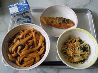 写真は、給食週間の地元食材を使っての給食(てまきごはんと青菜のすましじる&蓮台寺柿の干し柿、伊勢うどんと切干大根の中華和え)、そして、お礼の手紙の掲示物 です。