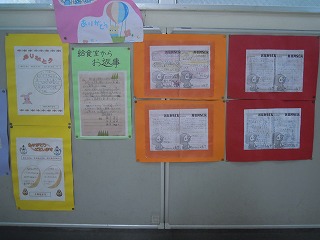昨日の1限目、児童集会では、給食委員会がその発表も行いました。その模様は、来週このページにアップします。1階廊下には、その集会でのクイズや各学級からのお礼状、調理員さん方からのお返しのお手紙も掲示されています。