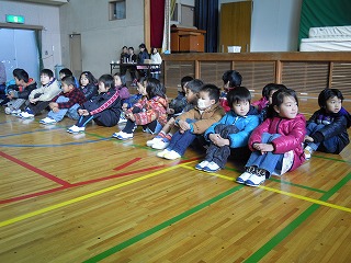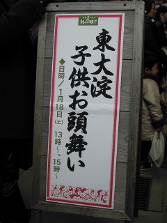 写真は、本番に入る前の子どもたち、看板と舞の一部 です。
