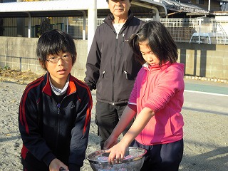 この記事では、朝7時半からの5年生の準備の模様を伝え、後の全校での焼きいもをいただいている写真はトピックスの方で掲載します。