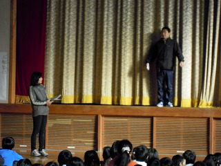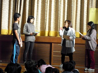 人権標語の発表の後は、先生たちが計画した「日常的にあるようなできごと」を劇にして、即興で演じました。提案から一週間、1〜2度はリハをしましたが、