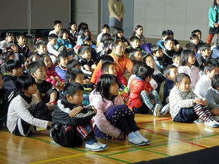写真は、劇を演じる先生方と見つめる子どもたち です。