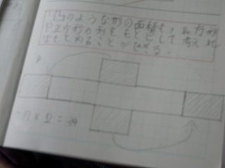ノートのような変形の土地の面積を求めよう、ということで、その土地を頭の中で切り取って、求めやすい形にしたり、実際に式を使っての求めたり・・・さまざまな考えを交流していました。