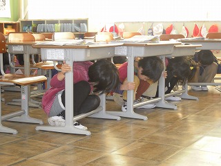 さすが、えらいもので、担任の先生の指導の下、みんな机の下へ頭部より入れて、机の脚をしっかりと持っている姿勢をとっています!!!教室等での不測の事態の際は、これなら大丈夫、と安心をした次第です!