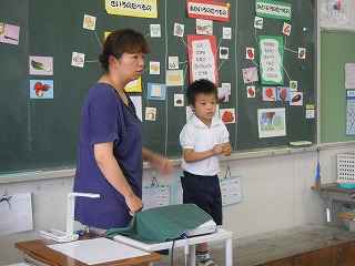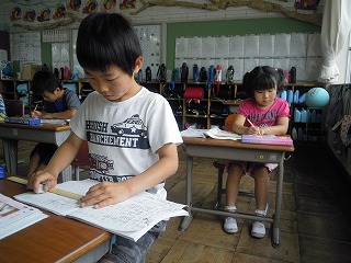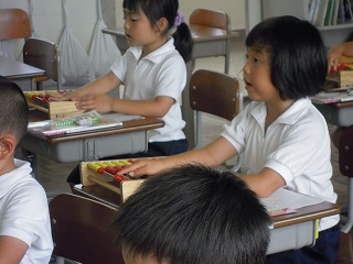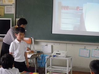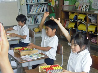 1年生は、大きなそろばんを使って足し算・引き算の学習をしています。ことばや文章も正しい日本語を使用しての授業で、感心をしています。たとえば、楠木先生が「紙を5枚持ってきました。3枚使いました」でとめると、誰かが「あーぁ、それは…」と言いかけますが、それを優しく止めて、「残りは何枚になりますか?」と文章を教えます。自分たちで問題を作る練習もすると同時に、○枚、○個、○本などの日本独特の数え方も押えます、見聞きしていると細かな配慮があるすてきな学びですよ。