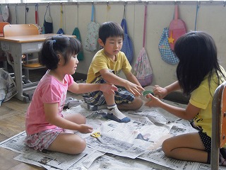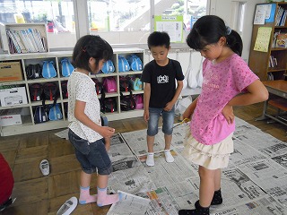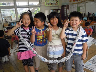 「新聞紙を使って、家作り」をしていました。新聞紙を独創的に張り巡らせて、各グループ独特の家やテントなどなどを作成中で、笑顔と真剣な顔がはじけていました。