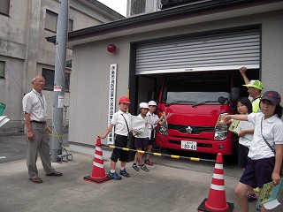写真は、官舎へ向かったグループが撮った危険の標示、大堀川へ向かったグループに画像、さらに保育園と水門へ向かったグループが見せてもらった町にある消防車 です。