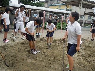 今日はみんなで何回目かの砂場掘り、つまり準備です。キャンプでカレーに使う予定のじゃがいも栽培もしていて、その観察も兼ねていました。