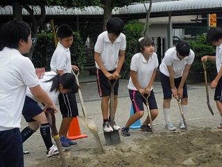 最近の各学年の体育は、鉄棒や雨の日のマット運動、1年生は転がしドッヂやペアやグループでのゲームをしていることが多いですが、6年生は、50m走の後は、鉄棒とあわせて走り幅跳びをしています。