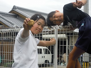 写真は、砂場掘りの風景、小さなじゃがいもを取り除いての2名のスナップ です。
