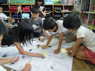 そして、先週、そのまとめとして、知りえた情報や見聞きしたことがらを各班で話し合いながら、取捨選択し、町の大きな地図へ記入していく作業を行いました。「防災マップつくり」です。
