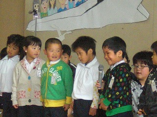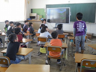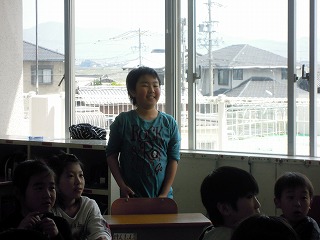 写真は、そのようす(発表している謙心君、逆光でぼめんなさい)です。