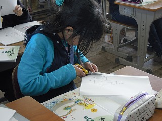 5年生は、少し変わった形のブロックを大きさを考える算数の授業でした。用意された紙に、そのブロックが描かれてあり、それを実際切ってみたりしながら、全員で意見を交流したいます。ここにも、私たちが求める子ども像を垣間見た気がしました。