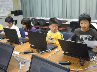 こうやって、楽しみながらコンピュータの使い方に慣れていくとイイですね(ゲームばかりせずに)。自分の好みのできで完成すると、ニッコリ笑顔の3年生でした。