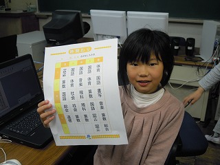 先週、3年生の教室をのぞいたら、だれもいない。「おかしいなぁ」と思って3階へ上がると、PC室から少し話し声。3年生全員が、玉木先生の指導の下、コンピュータを使いながら、思い思いのデザイン・色を使い、自分の3年生の時間割を作成中!!!