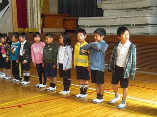 子どもたちはいつもより輝く笑顔で登校。まずは、人数確認と朝のいつもの健康状態確認をして、運動場へ整列!縦割り班での整列です。