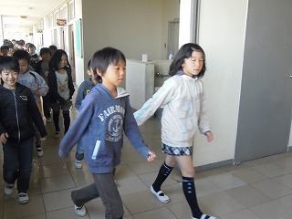「震度5強の地震発生、津波の予想があるので、屋上へ」という設定で、全校で初めて屋上への避難を実施しました。整然とかなり速足で、子どもたちは屋上へ・・・