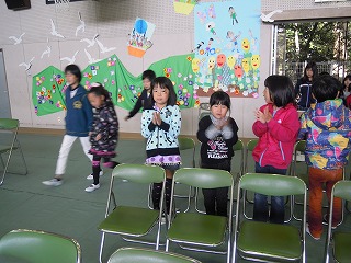 フルーツの単語をしっかりと発音させながら、ペアでキーワードのフルーツが出たときには、目の前の消しゴムを取り合うゲームです。笑顔はじけて、楽しそう。担任のコ田先生も思わず笑ってしまうほどの反応でした。