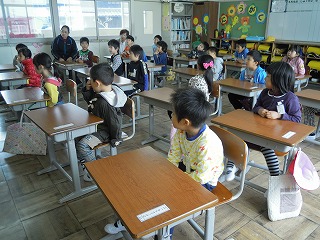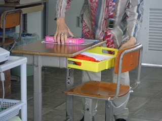 担任の楠木先生の指導の下、行儀よくすわり、カバンも自分のロッカーに整然と入れられ、気持ちいい限りです。楠木先生は、ていねいに、そしてゆったりと、朝登校してから、どんな準備をするか?机の中の整理整頓はどうするのか?どこへ何を入れるのか?…などなどを、一歩ずつ教えてみえます。