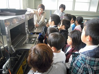 その合間をぬって、1年生は、給食室探検を実施しました。6年間でたった一回だけ、給食室へ入ることのできる日です。給食調理員の織戸さんと岡澤さんから、給食ができるまで、と家にはない大きな調理器具の説明を受けました。
