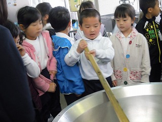 各器具が動いたときの大きな音や試験的に動かしてもらった器具の反応に大喜び!笑いも出て、楽しそうでした。大きな釜では、巨大しゃもじで実際の調理の練習も・・・わくわくの一時間でした。