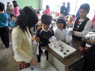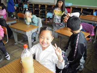 2年生は、6年生の助けを借りてのEM菌つくりです。写真は、協力助ける6年生と興味深々でEM菌を入れる2年生、ペットボトルに仕上げて待機の2年生 です。