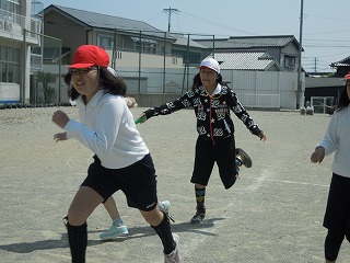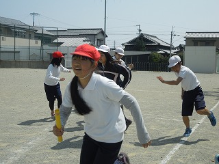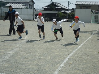 先日、体育で50M走を記録していると思っていたら、今日は、4組に分かれてのリレー!