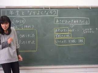 1年生の隣の2年生教室では、「1年生と仲良くなろう」というテーマで、話し合いが行われています。どんなことをするとか、どういう気持ち(難しい言い方だと「姿勢」)で接するとか…なかなかいい方向の意見が多く出ています。