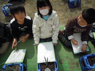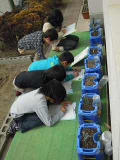 何をするのかな?と思っていっしょに行ってみると、自分たちが育てている水仙の鉢の観察を。東大淀小の1年生の水仙はまだ咲きません(残念!)春よ早く来い!!!ですねぇ