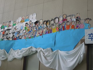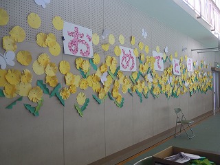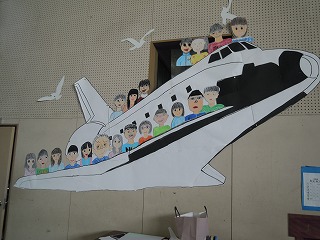 今年は、「明日という未来」へ出発、ステージ左側には、6年生の似顔絵を乗せたスペースシャトルが飛び立つ寸前。相対する壁面には126名の1〜5年生の似顔絵を乗せた見送るクルーザーが・・・横の壁には春の象徴のひとつ、たんぽぽの花と蝶が数多く飾られています、3・4年生の作品です。逆の面には、1・2年生の運動場風景が・・・今日の午後のかんぺきに仕上がるでしょう!!!楽しみです。