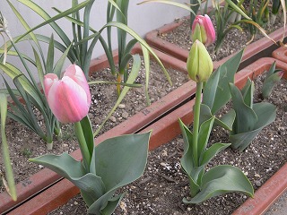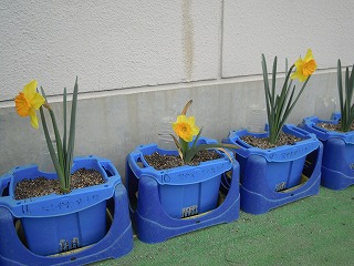 先週、1年生がまだ咲かない水仙を写生観察している姿をお知らせしましたが、この陽気で一気に一年生の水仙とチューリップが咲き始めました。それぞれの鉢やプランターは保健室から1年生教室の前で栽培されています。