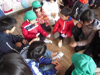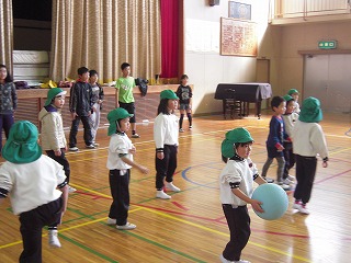 アルトリコーダーの合奏や合唱を披露したあと、2つのグループに分かれ、戸外での鬼ごっこやリレー、ドッヂボール、室内でのカルタとりや独楽回しなどを園児年長さんたちといっしょにしました。「ずっといたい」と無邪気に感想を言う6年生に思わず吹き出してしまいました。