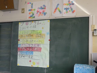 写真は、受付をしてくれた二名の4年生、開会前の表情、そして音楽室の黒板に貼られたプログラムと題字です。