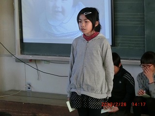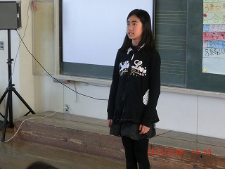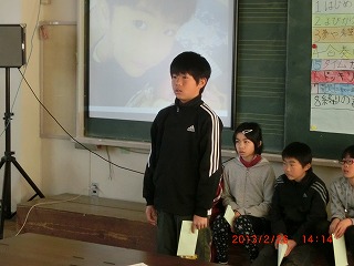 写真は、代表で始めの言葉を述べる4年生、そして、一人ひとりの発表 のものです。
