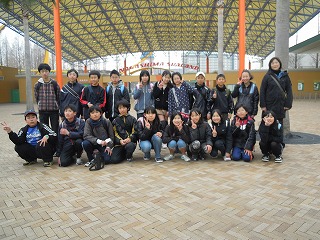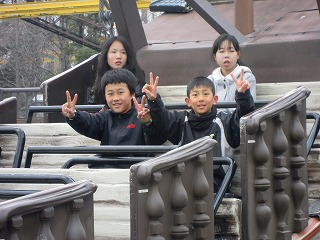 写真は、出発前の6年生、園内でやっと出会えたバイキングの中でのピース、最後の記念撮影 です。