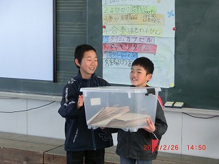 いつも登下校の安全を見守っていただく学校安全ボランティアの方々への感謝のお手紙を渡し、次に、学校タイムカプセルへ入れる未来の自分たちへの手紙をみんなで確認しました。