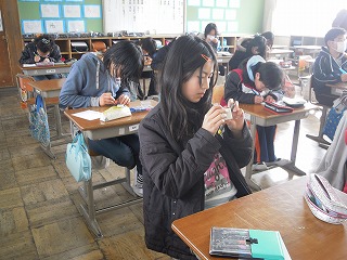 そんな中、卒業制作の一つ、落款(自分の名前のゴム印)つくりが佳境に入りました。最後の細かな自分の名前を彫る最終段階です。みんな一言も話さず、集中して彫る作業を進めています。教頭先生と特別非常勤講師の西村先生が時折アドバイスをする以外は、声が聞こえず、凛とした中での授業です。さすが!!!