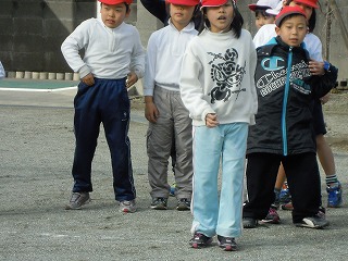 写真は、じゃんけんダッシュ前、サッカーボールを蹴った行方を真剣に見る2年生 です。