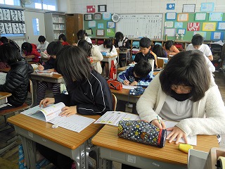今週火曜より、5年生は担任の先生が体調不良で金曜日までお休み。教頭先生が授業をしたり、音楽や英語の授業を組みながらの毎日です。日ごろの指導の成果で、子どもたちは自主的かつ明るく学習を進めています。毎時間先生が変わるのは中学校の練習ですね!