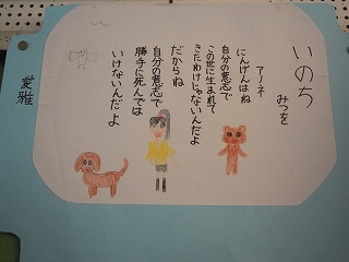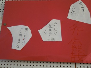 監督をしている私は、教室後ろの5年生が選んだ好みの言葉・詩を書いた色画用紙が気に入って、思わず写真を撮りました。