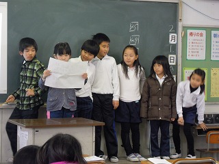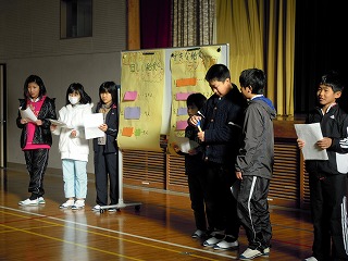 内容は、『3年生の好きな教科』『好きな場所』などです。3班に分かれての発表でした。発表の姿勢や声の大きさ、聴く雰囲気は良かったです。これからは、原稿を見ないで、自分の言葉で、かつ、いろいろな指示や動作も入れてのプレゼンができれば、近い将来にプラスになるだろう、と思いながら、感心してみていました。えらかったね、3年生。