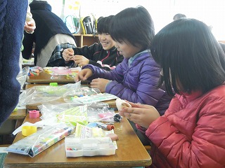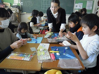 写真は、1年生親子、4年生の女子友だちが作成中、2年生親子 のものです。