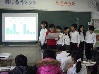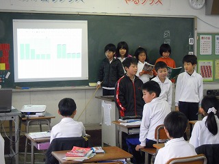 3年生が続きます、先日授業を参観に廊下を歩いていると、3年生の男子が「今から発表するで、校長先生どうぞ」と招待してくれました。喜んで教室へ入ると、自分たちがアンケートした結果をエクセルでグラフ化し、データとして発表する(プレゼンテーション)の授業でした。