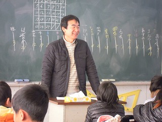 写真は、笑顔の加藤先生と5年生の風景 です。