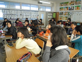 6年生が「今年の抱負の漢字一字」を考えているとなりでは、5年生が、加藤先生を中心に、「冬休みの思いや感想」を交流していました。